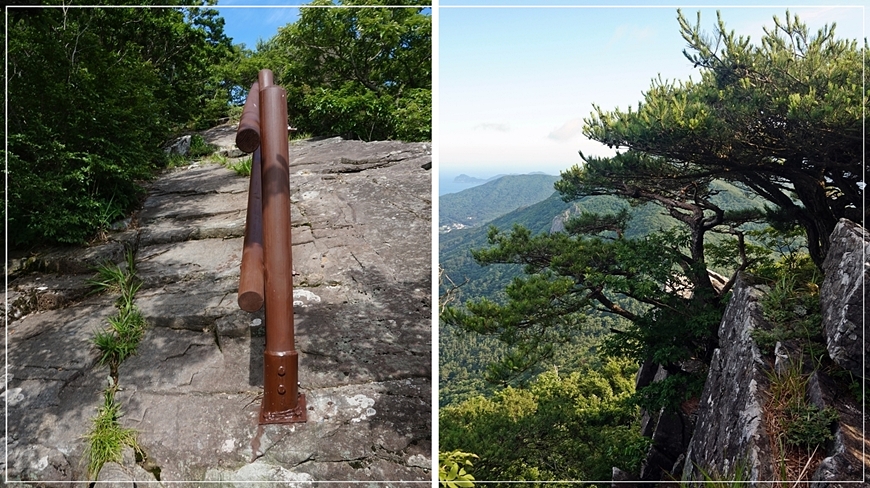 산행해 난간이 있는 경사진 바위를 타고